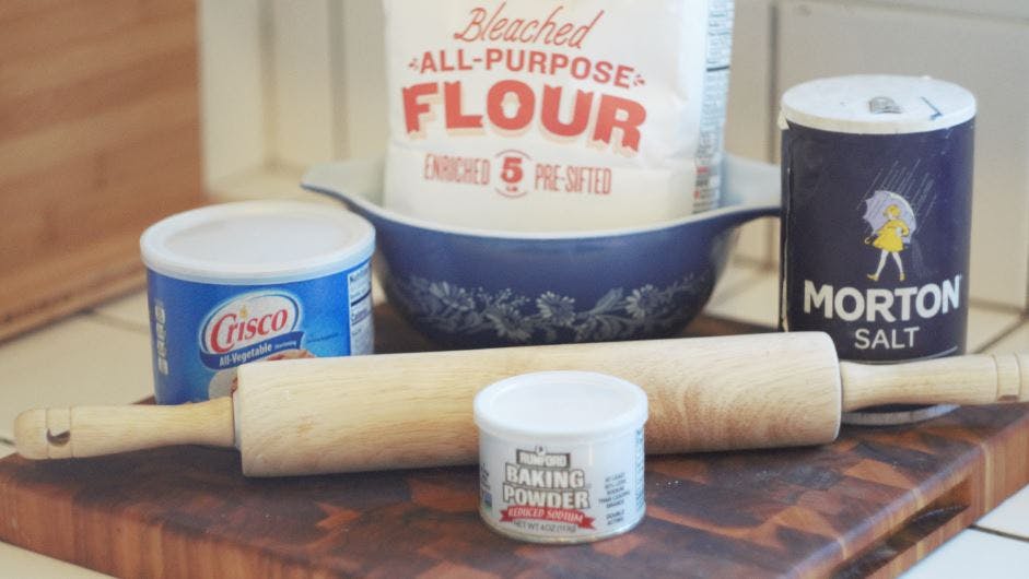 Mix flour, baking powder, salt, and Crisco in a mixing bowl. Slowly add the water into the mix. Mix with a fork, then hands, until the dough forms a large non-sticky ball. Place a damp towel over the bowl, and let the dough rest for 25-30 minutes.